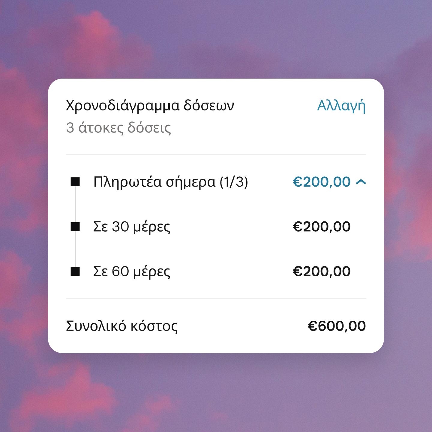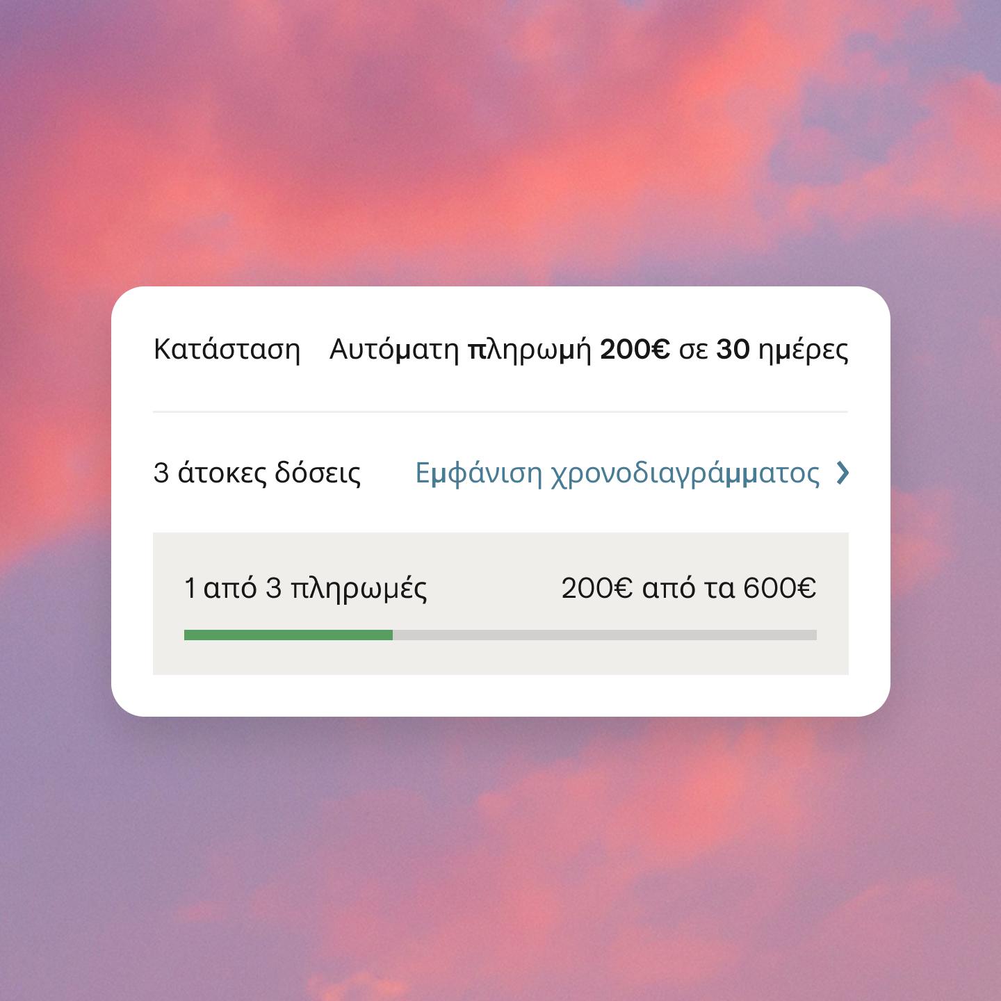 Η πρώτη πληρωμή πραγματοποιείται τη στιγμή της αγοράς, ενώ οι υπόλοιπες δύο δόσεις προγραμματίζονται αυτόματα κάθε 30 ημέρες.